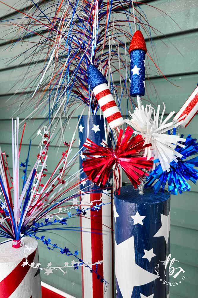 This is the “use literally whatever scraps you have” project on the list. Cut three wood cylinders or rectangular blocks in varying heights, paint them red, and glue a small bundle of twine at the top of each one to mimic a firecracker fuse. Wrap a thin strip of white and blue washi tape around each cylinder for the stripe effect. Group them together in a small wooden crate or basket and set on a porch step or front entry table. The whole project costs about $2 and takes 30 minutes.
