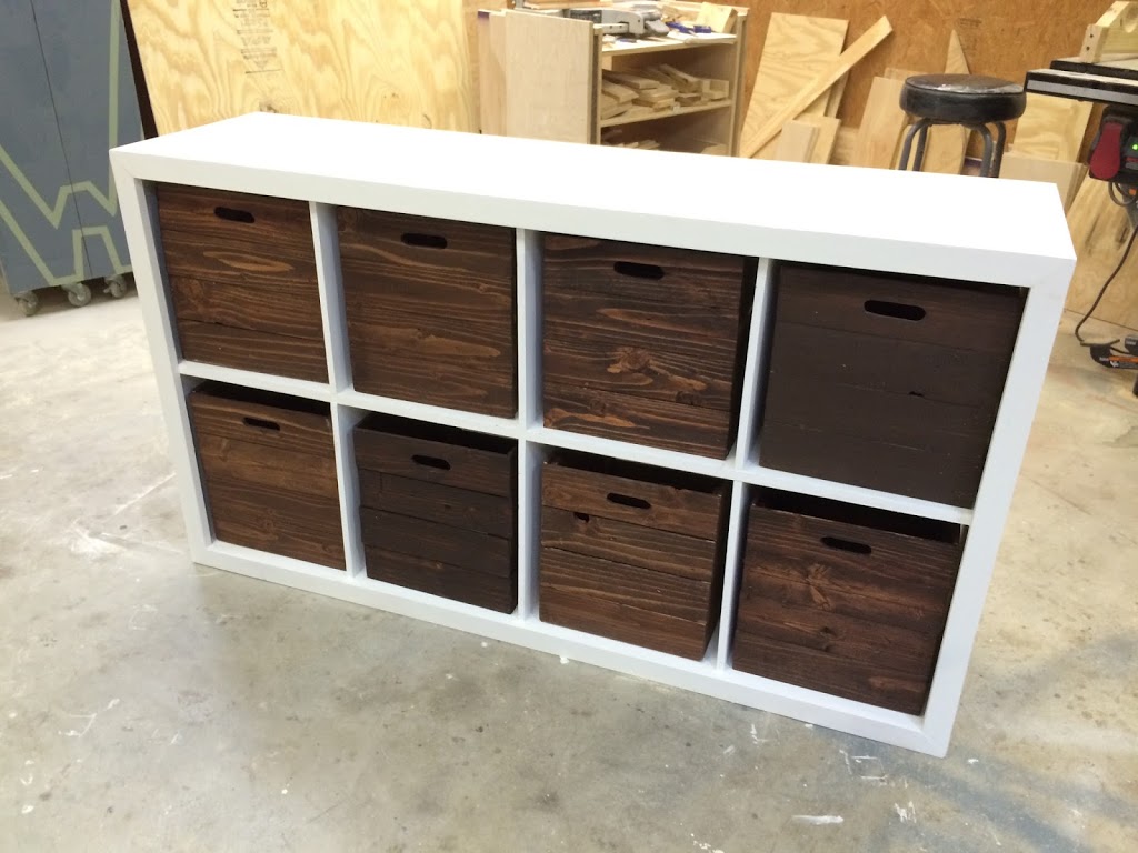 Materials: Wood board for backing, smaller scraps for shelves and dividers, wood glue, screws, hooks, finish