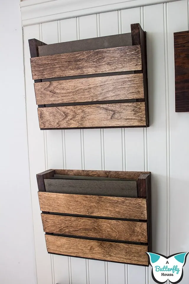 Wine bottles need homes too. Drill holes slightly larger than bottle necks into your wood, sand everything, finish it, and mount it on the wall. Holds bottles horizontally and looks sophisticated. Your wine collection just leveled up.