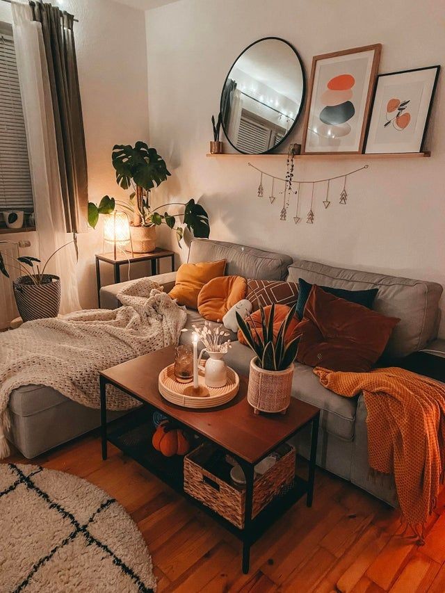 Layer warm-toned blankets and add candles or lanterns for that glowing, intimate ambiance. Earthy colors like burnt orange, mustard, and deep forest green work beautifully this time of year. Don’t forget a seasonal-scented candle—think cinnamon, vanilla, or pine.