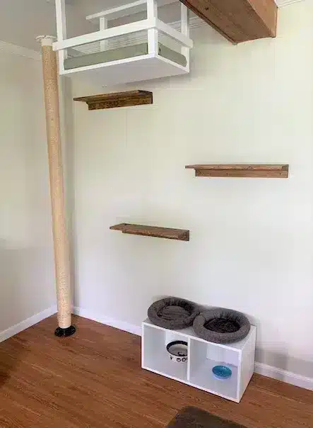 For families with cats, wall-mounted stairs are a fun way to involve kids in pet care. Use small planks to create steps leading to a perch, then decorate them together.