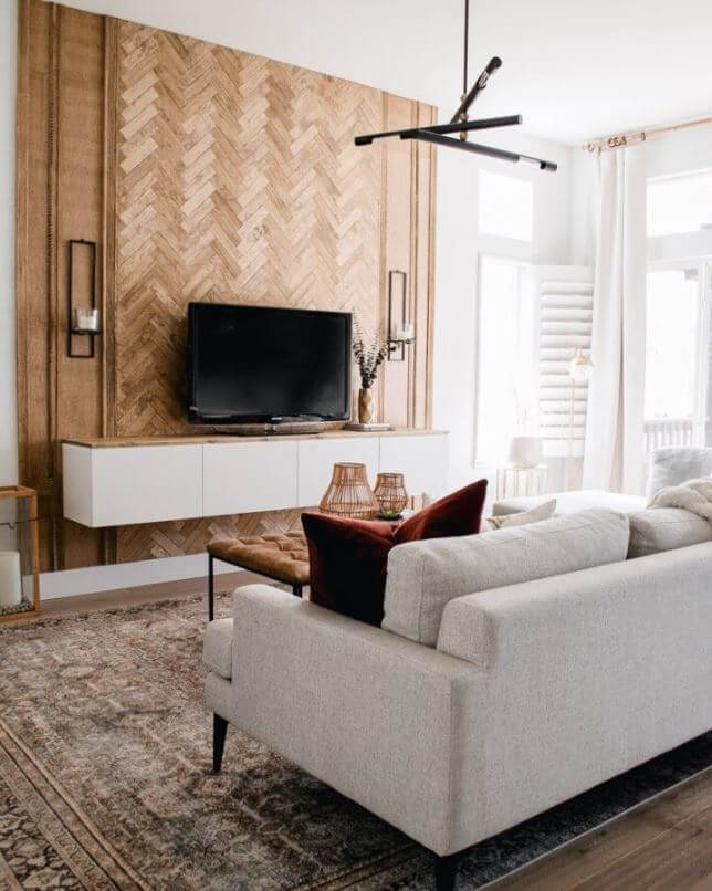 Create a dynamic visual effect with staggered wood planks of varying lengths and widths. Mixing different wood stains and finishes can add an extra layer of texture and rustic elegance. This works beautifully as an accent wall behind a couch or bed.